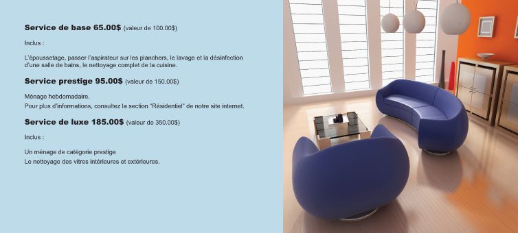 Passer l’aspirateur sur les planchers, laver et sécher tous les planchers, nettoyer et désinfecter les thermostats, les poignées de portes, épousseter les plinthes électriques, bouches de ventilation, nettoyer les marques de doigts sur les murs et laver les rampes d’escalier, passer l’aspirateur.